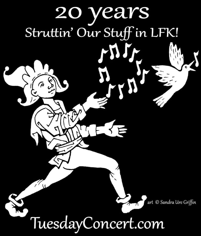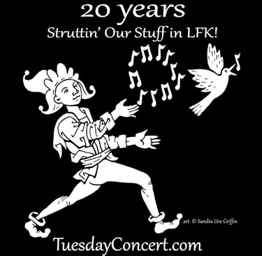 Friends - Yep, this Tuesday Concert Series is now the BIG TWENTY. I started this series at Signs of Life Bookstore in 2004 (two years off due to the pandemic) and moved it to the Lawrence Arts Center in 2010. To celebrate our 20th, I'm planning on making the spring, 2026 season one of the best yet, including free Tuesday Concert "Juggling Jester" stickers to go along with an incredible lineup of music.